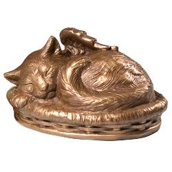 This cat memorial urn is made from a blend of resin and bronze powder known as cold-cast bronze. The urn showcases a serene scene of a cat resting on a pillow, and features a hand-polished bronze patina. With a bottom-opening stopper that does not need adhesive, it also includes a blank gold-tone heart-shaped plastic plate to be applied to the tag on the collar. Measuring 6-3/4 inches in width, 5 inches in depth, and 3-3/4 inches in height, this urn has a capacity of 35 cubic inches.