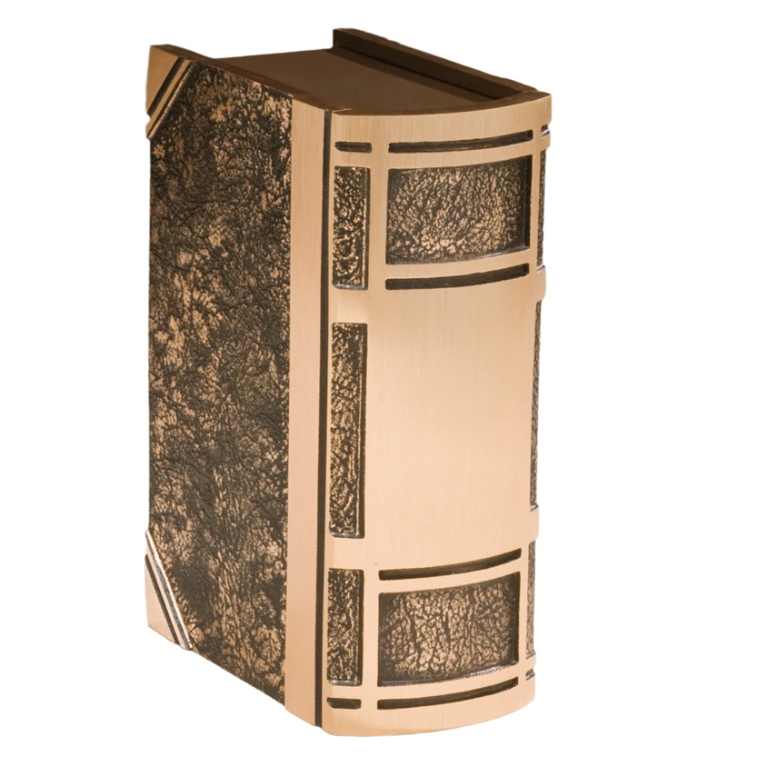 This solid cast bronze urn is ideal for discrete placement on a bookcase or mantle. Front-opening panel attaches with screws.
