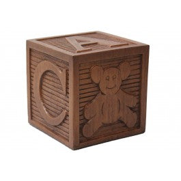 The Building Block Urn is designed to resemble a classic children's toy with its simulated wood block and teddy bear side, while the other sides display letters and numbers. It also features a bottom-opening stopper and comes in 3 finishes. Capacity of 32 cubic inches. Size: 4.375" cube.