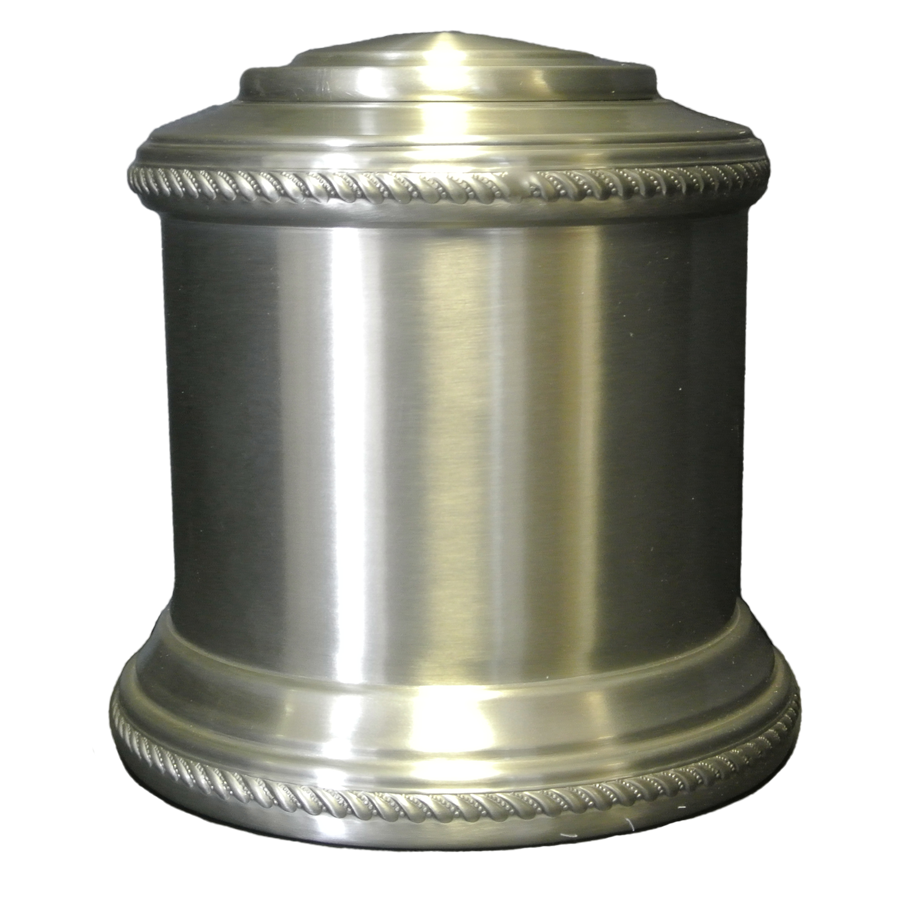 A beautiful spun pewter urn with a brushed finish and roped accents. Top-opening threaded lid on larger sizes, bottom opening on the 17-1/2 cu. in. size. 1/ea.