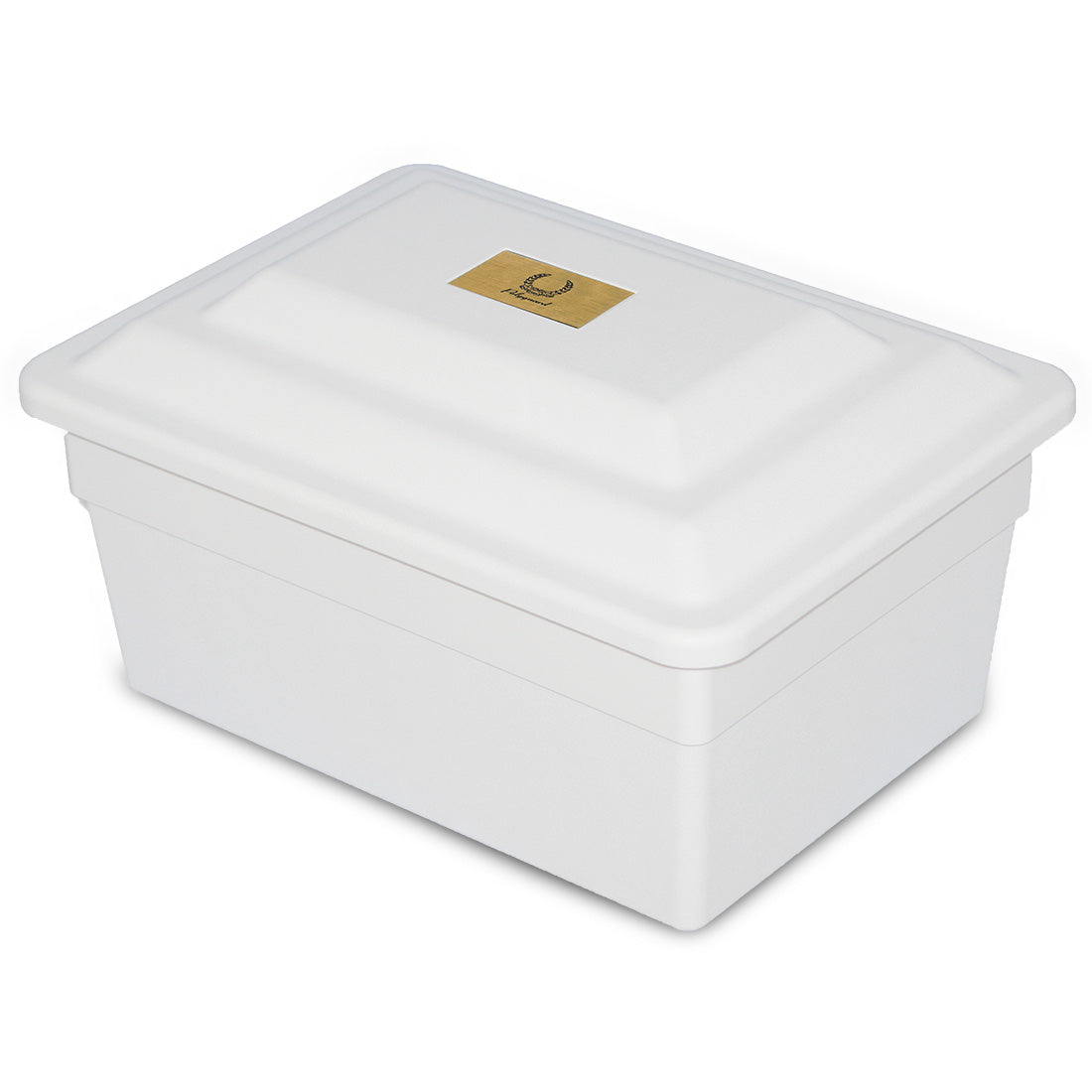 Light-weight high-density polystyrene. This protective urn vault is water resistant, non-biodegradable, and sealed with a silicone sealant for lasting permanence and peace of mind.