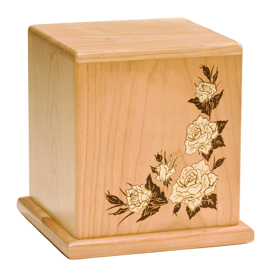 Natural cherry with beautiful inlaid cut white roses. Bottom-opening with screws.