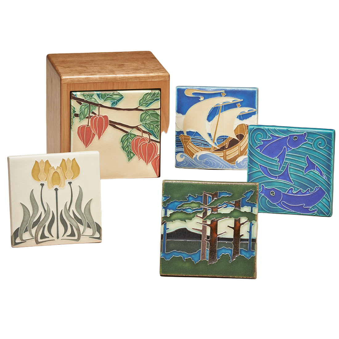 Natural cherry wood urn with a choice of distinctive tiles that have rich glazes and decorative designs. Tiles choices include: Tulips, Japanese Lanterns, Magic Ship, and Nouveau Fish. Bottom-opening.