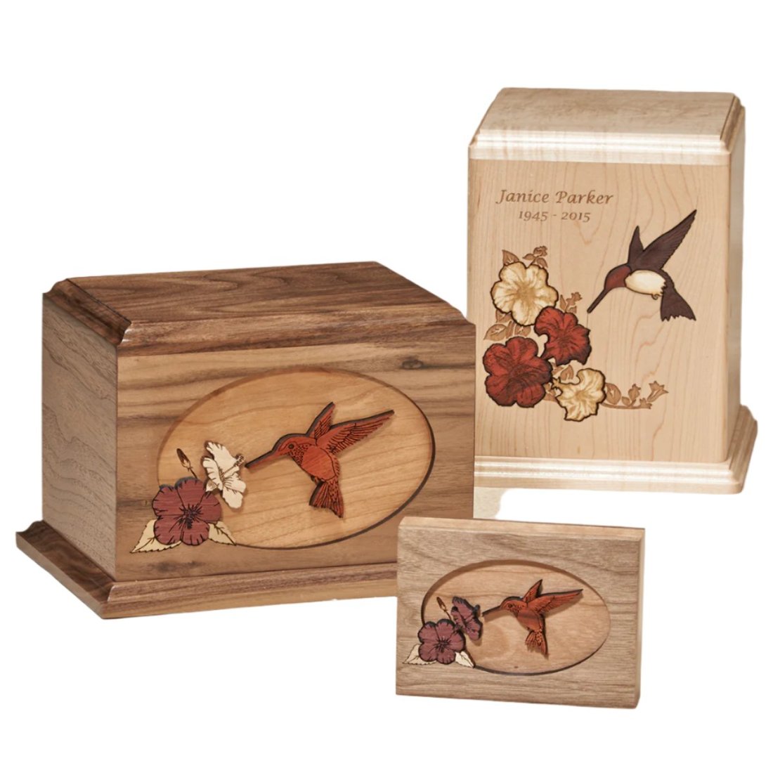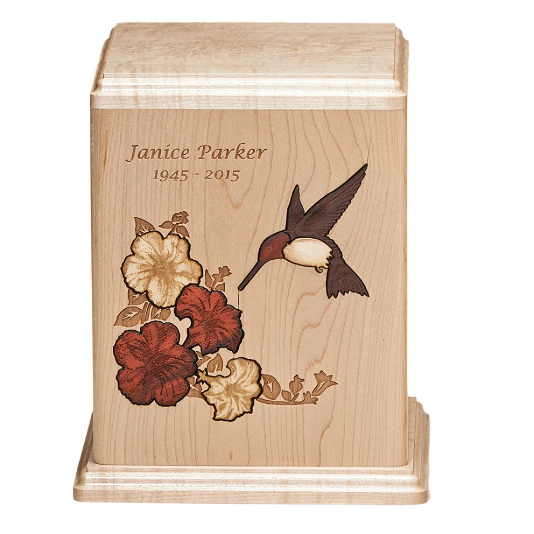 The beautiful three dimensional artwork portrays a hummingbird enjoying the nectar of beautiful flowers. The keepsake model features a cylinder that can hold cremation ashes, a lock of hair or a small ring.