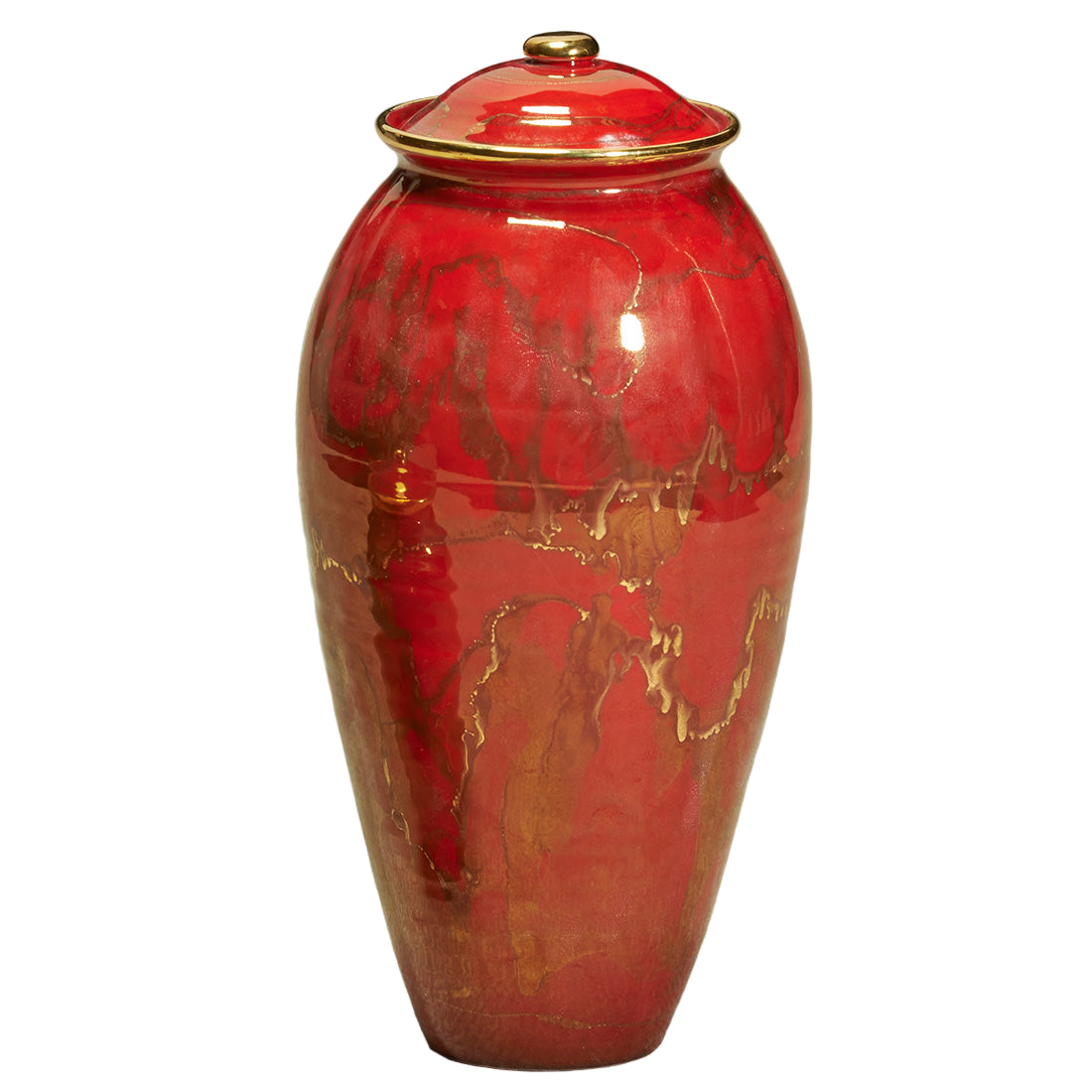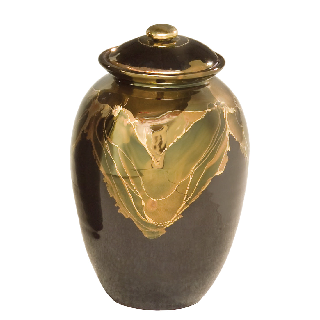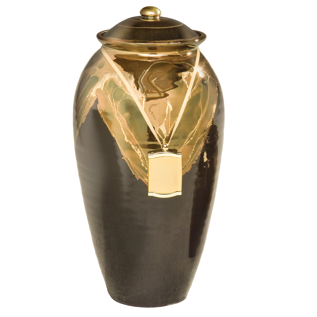 Hand-thrown ceramic with a luminescent ebony finish created from a glaze containing 22k gold. Top-opening lid. Shown with optional hanging frame pendant (item: 538266).