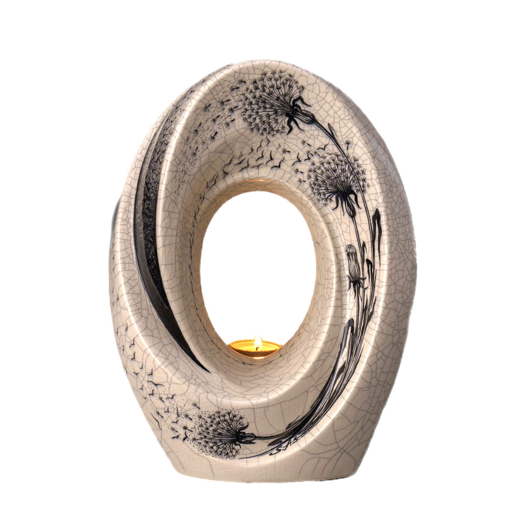 Exquisite in every detail, this custom ceramic urn is exclusively hand-crafted by skilled artisans from Bulgaria, showcasing a mesmerizing, crackled finish and a captivating design of dandelions and birds taking flight, which symbolizes liberation and freedom. Its sophisticated lines and profound symbolism make it a true masterpiece, and with the added convenience of a candle holder, it becomes an exceptional decorative addition to any interior, as it enables the lighting of a memorial candle during moments of remembrance. A keepsake is available upon request. Bottom-loading.
