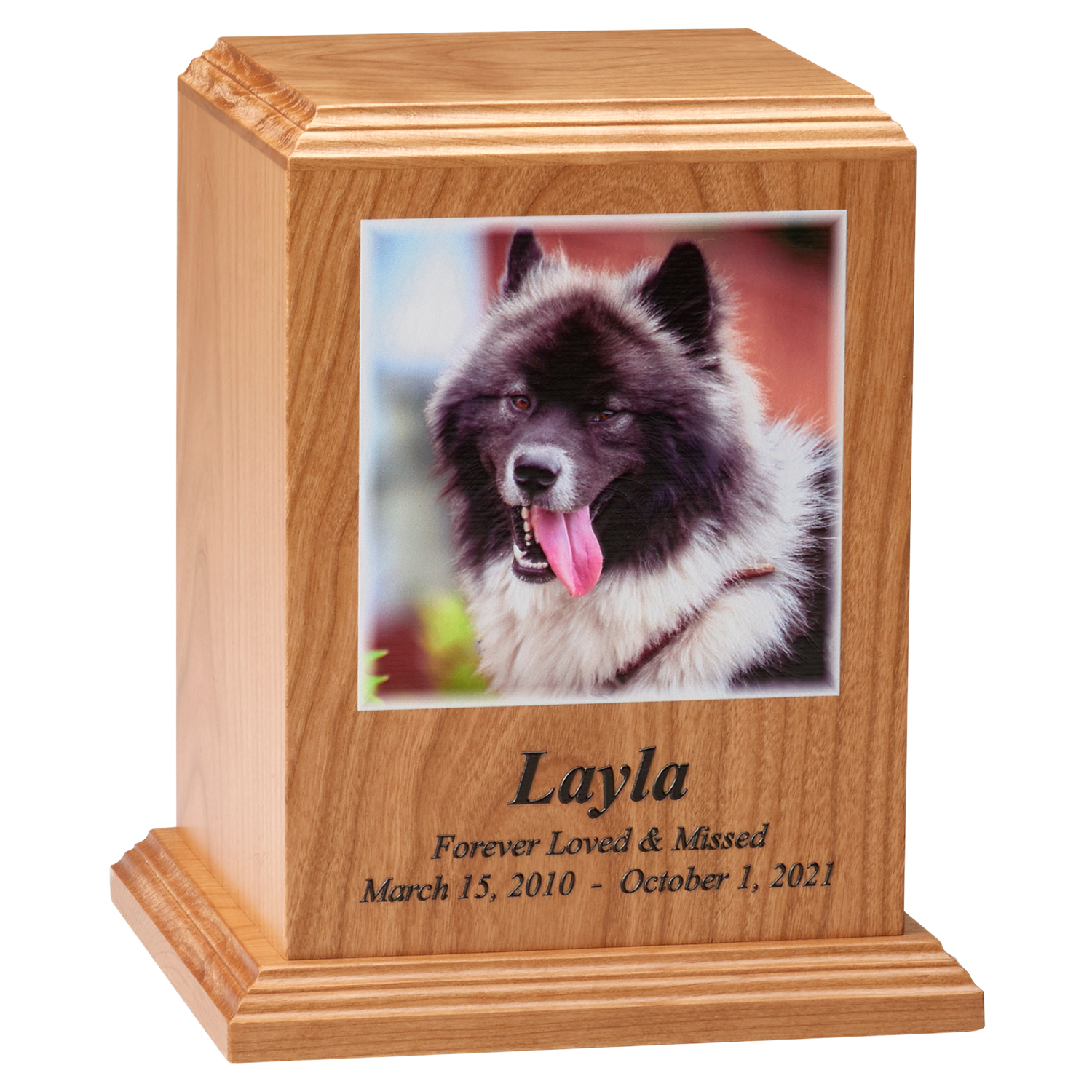 The Premier Texture Photo Urns feature an innovative UV cured printing process that delivers a lifelike image with a raised printed surface, allowing families to touch and feel the image on their cherished memorial. It includes up to 3 lines for personalization, as well as the ability to add a photo of your beloved pet. It is available in 3 sizes and 5 different wood finishes.