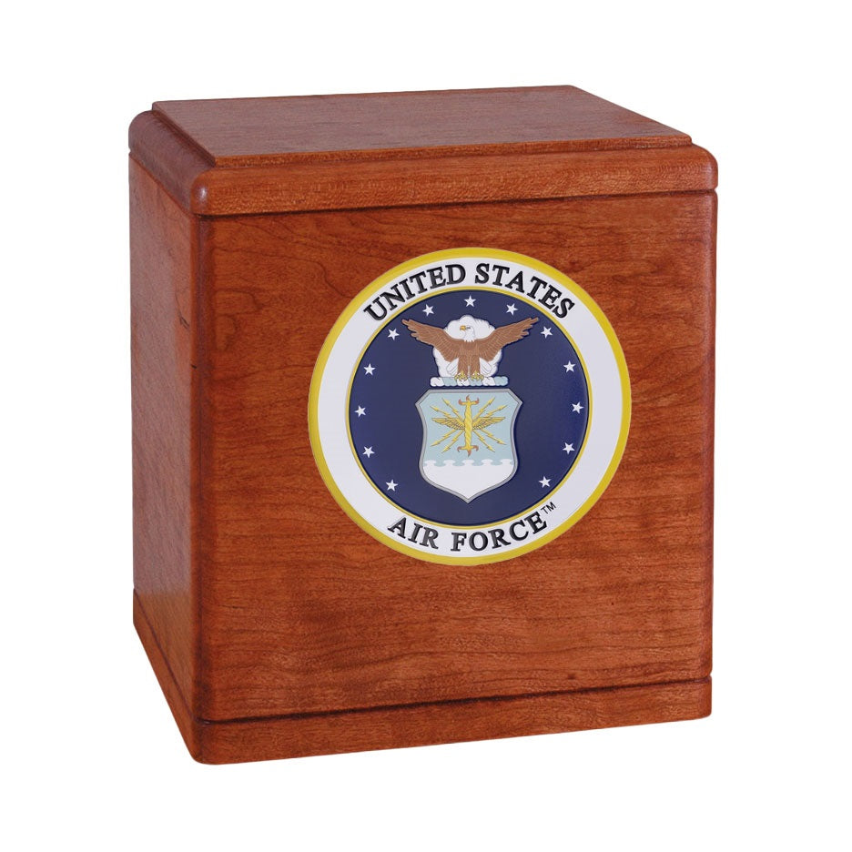 Cherry Urn with satin finish, you may choose plain urn or choice of a 4" embossed military emblem, Army, Navy, Air Force, Marine Corps.