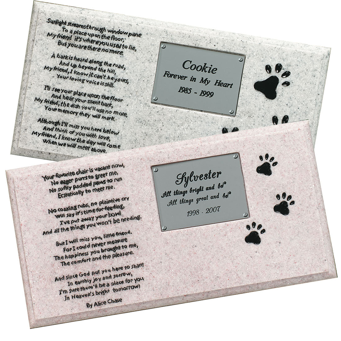 Verses evoking nostalgic memories of a favorite dog or cat are inscribed on the surfaces of these simulated granite items. Includes the name, numeric years of birth and death and a short line of sentiment on a 4"W x 3"H weather-resistant and UV-stable laminated engravable plate; silvertone with black characters; plate attaches to base with four stainless steel screws. 14-1/4"W x 7-1/3"H.