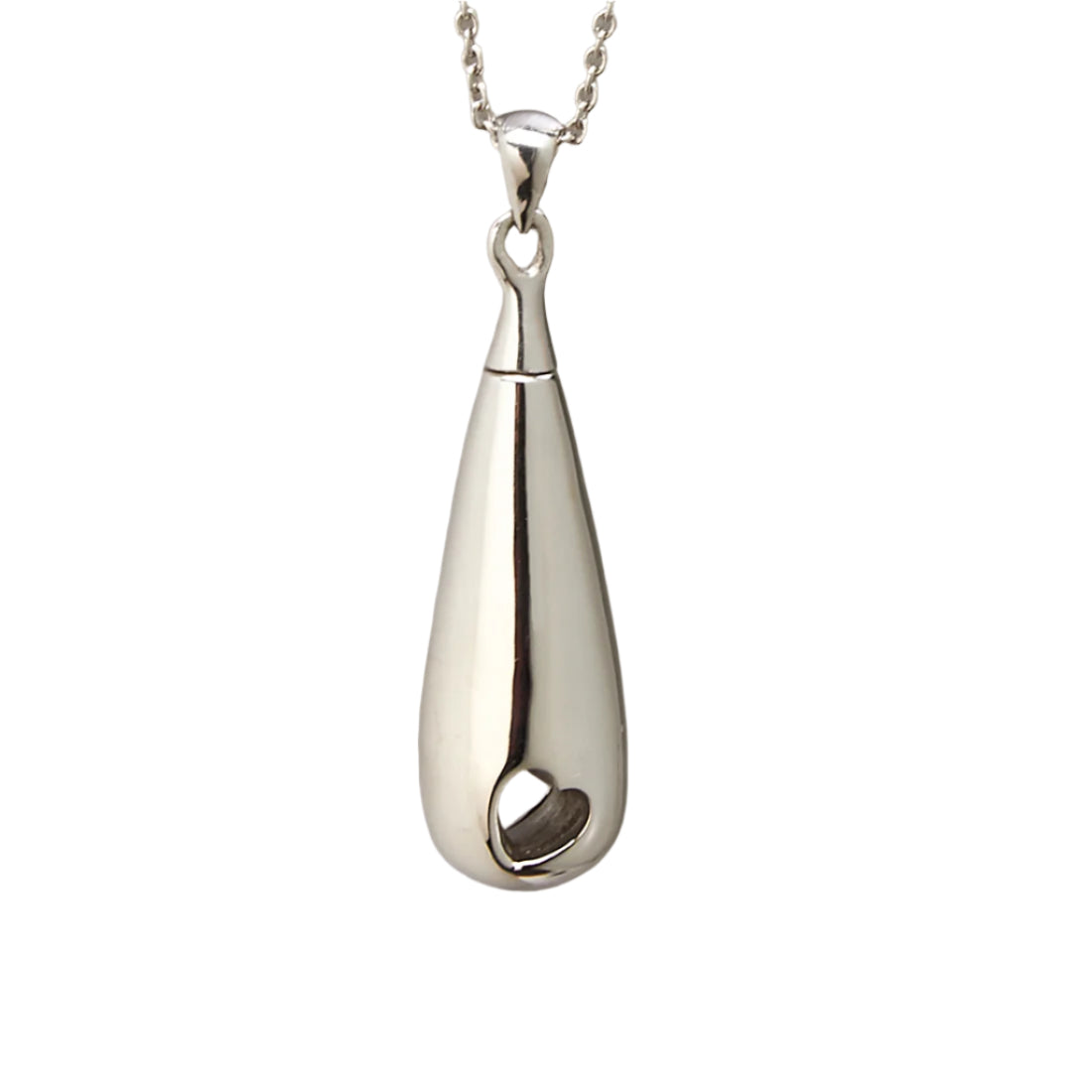 Sterling silver. 7/16"W x 1-5/8"H. Includes 18" matching chain, presentation box, jewelry cloth and filling tools. Designed to hold a small amount of cremation ashes, earth from grave site, or pressed flower petals from service.