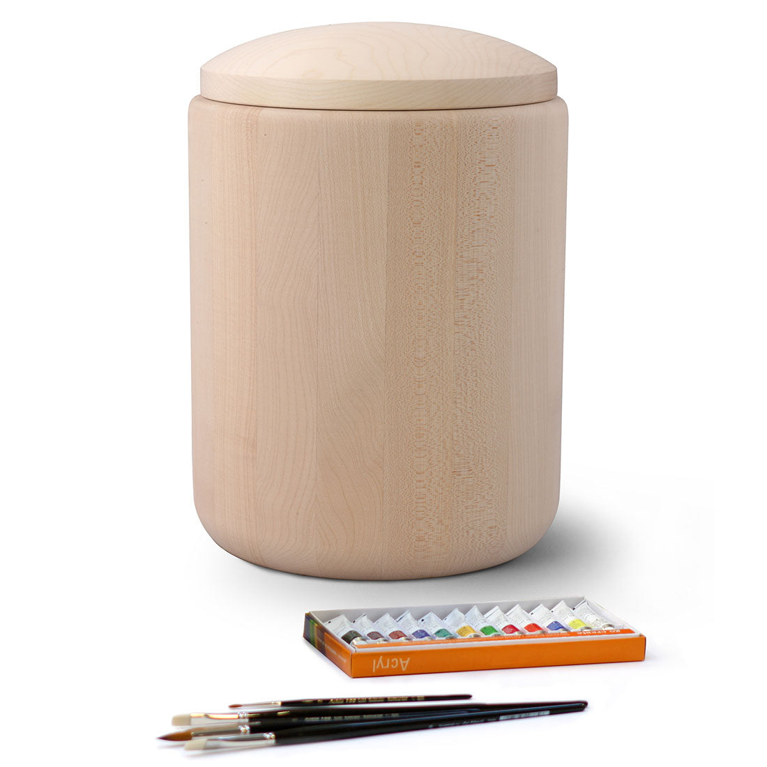 The Uniquely Yours Urn is made of solid unfinished maple and includes an acrylic paint and brush set, allowing for a one-of-a-kind personalized memorial when painted. Featuring a top-opening and a capacity of 305 cu. in., this urn is 7-7/8" in diameter and 10-2/3" in height.