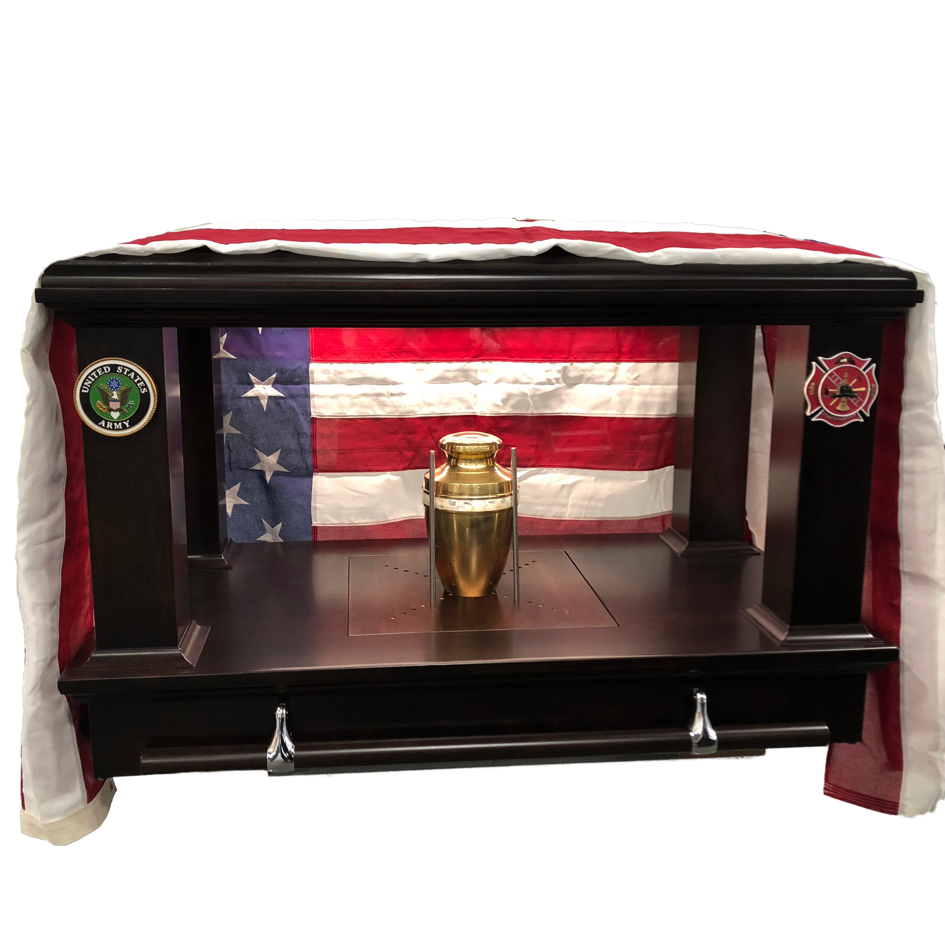 Amish-Crafted Maple hardwood design with weather resistant laquered Onyx finish. Provides professional and consistent urn management. Facilitates the use of pall bearers. Accommodates flag, pall or floral blanket. Accepts keepsakes and memorabilia to personalize the remembrance and reflective experience. Features a fully self-contained storage compartment for battery, flag band, urn stabilization posts, etc. LED lighting system focuses view and attention on urn . Designed to display and move using standard church truck. Includes 2 rechargeable batteries and recharging system. (Flag, urn and appliques not included)