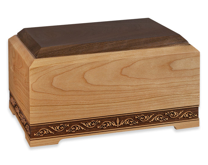 Natural cherry with a dark walnut top. Bottom-Opening.